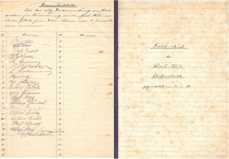 Gründungsversammlung 15.01.1922: Anwesenheitsliste (links) und Titelseite Protokollbuch (rechts) |