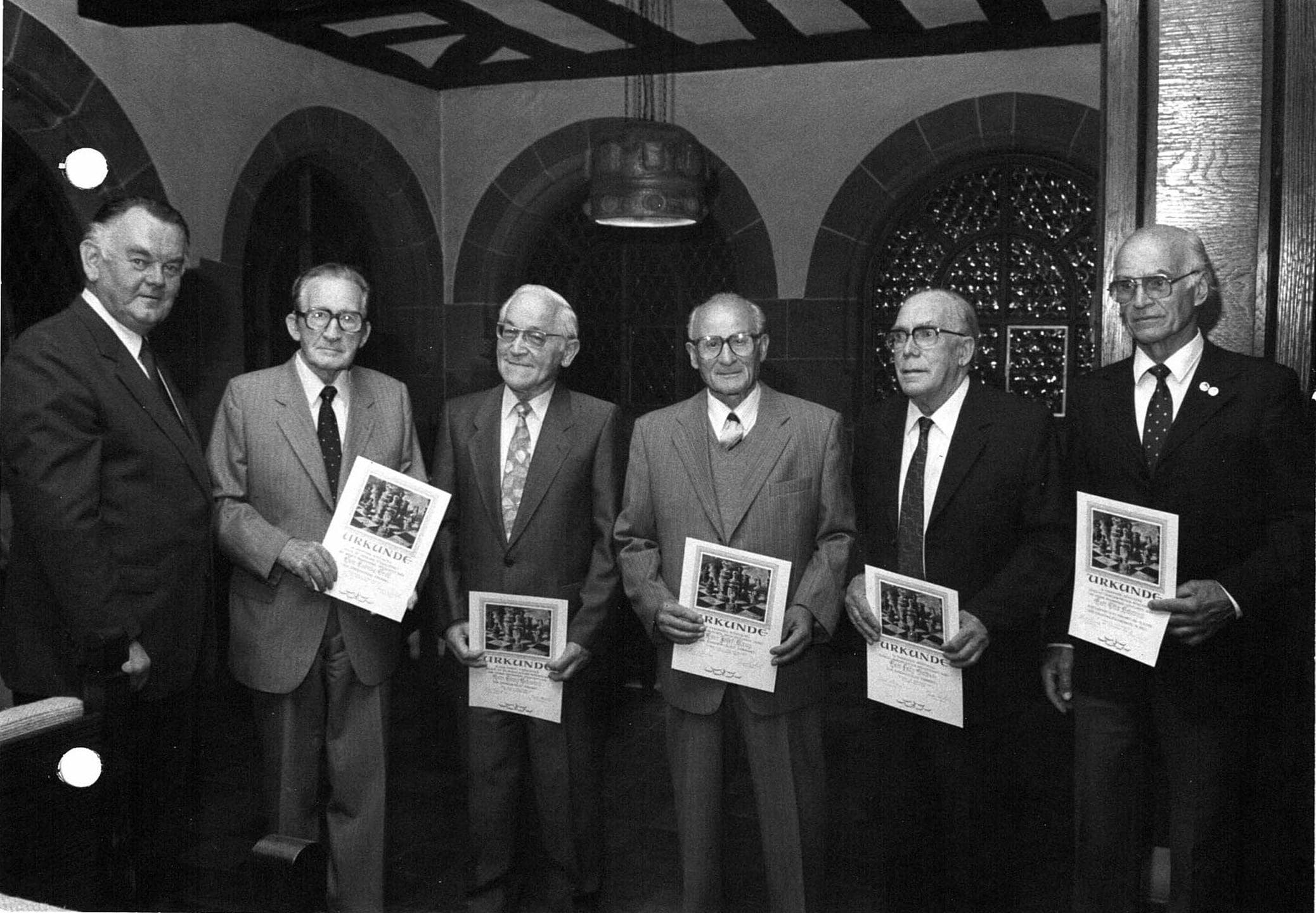 Ernennung von Ehrenmitgliedern im September 1986 (v.l.n.r): Kurt Schade (1. Vorsitzender), Ludwig Groß, Franz Schwind, Josef Krug, Fritz Sutter, Otto Schwind |